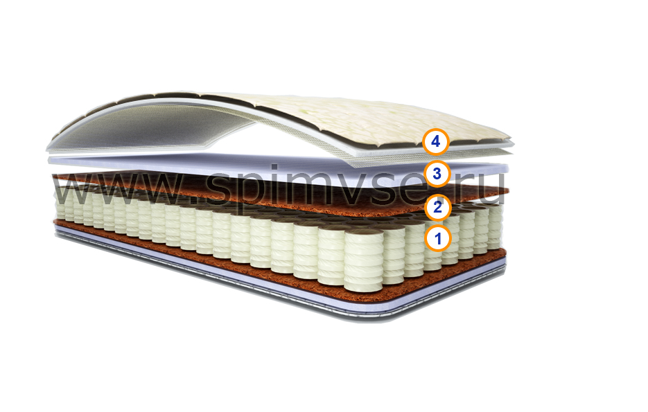 Жесткий слой в виде кокосовой плиты (2) создает ровную основу для верхнего мягкого слоя и служит отличной изоляцией пружинного блока (1), увеличивая технический срок эксплуатации матраса.