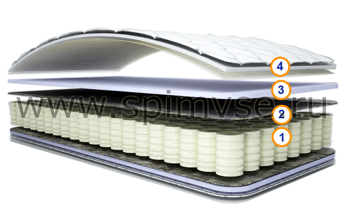 1, Пружинный блок Pocket Spring (он же TFK, он же S-500, он же пружины карманного типа), плотностью 512 пружин на условное спальное место. *Каждая пружина помещена в отдельный "карман", который по высоте меньше пружины. Регулируя высоту "кармана", можно делать матрасы разной высоты без ущерба для качества.