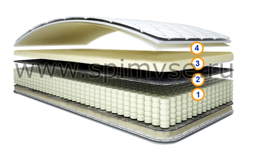 1. Пружинный блок MULTI POCKET (он же S-1000, или блок пружин карманного типа*), плотностью 1000 пружин на одно условное спальное место. Основа матраса. Благодаря независимым пружинам и увеличенному числу пружин на кв.м. (или на одно спальное место) в пружинном блоке MULTI POCKET, обеспечивается индивидуальная, анатомическая поддержка контуров тела для каждого партнера в отдельности.
